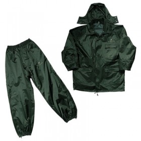 Realizzato in nylon mano morbida leggero e robusto di colore verde, impermiabile al 100% fino a 5.000 mm, tutte le cuciture sono termosaldate per evitare infiltrazioni d'acqua. Utilizzabile come completo o separatamente giacca o pantalone . La giacca con lunghezza fino sopra ginocchio, presenta sull'anteriore due ampie tasche e taschino chiudibili con velcro, chiusura frontale con cerniera a doppio cursore e velcro, polsini elasticizzati a scomparsa e cappuccio staccabile con bottoni a pressione. Il pantalone con chiusura frontale con zip e bottone a pressione, vita e caviglie elasticizzate.
